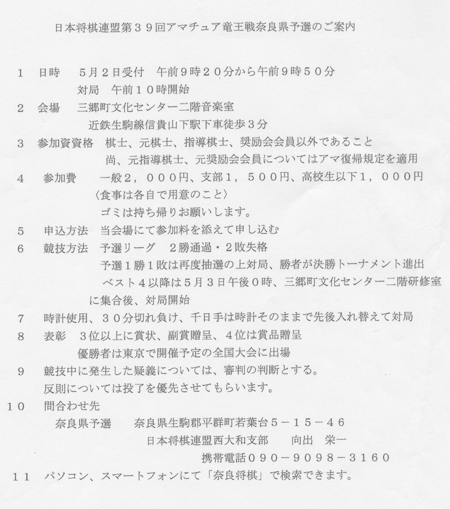 - アマチュア竜王戦(アマ竜王戦) は、読売新聞社・日本将棋連盟共催の棋戦です。それまで行われていたアマチュア将棋日本一決定戦にかわって開催されました。予選は例年1月から5月にかけて各都道府県単位で行われます(さらに地区予選を行う所もあります)。それを勝ち抜いた代表選手56人による全国大会が例年6月に行われます。奈良県大会は4・5月に、三郷町文化センター(西大和支部主催)で行われます。