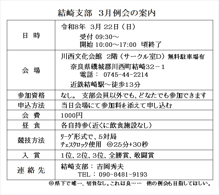 結崎支部1月の例会は、支部名人戦、実施のため休会。