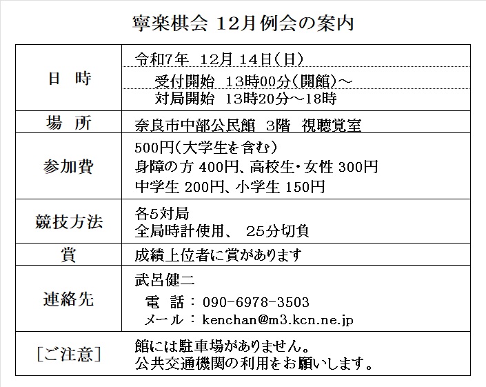 - 寧楽棋会の結果の報告と、次回の予定を報告させていただきます。