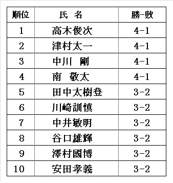4勝1敗(5名)… 山根紘矢、後藤利喜夫、北村慶明、高安信行、武呂健二