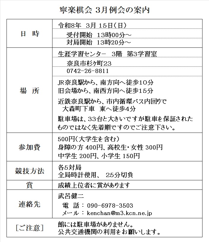 - 寧楽棋会は、原則毎月第2日曜日に12時30分から奈良市生涯学習センタ-で、例会を実施しています。