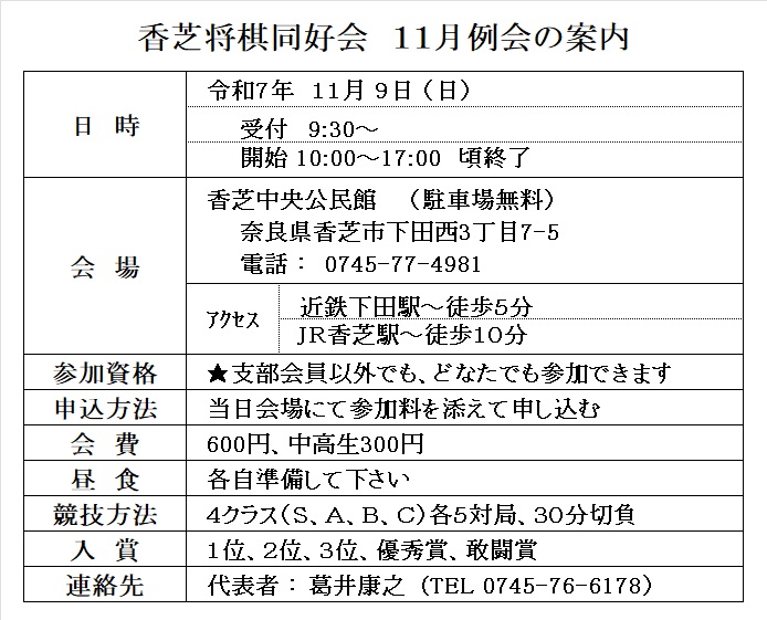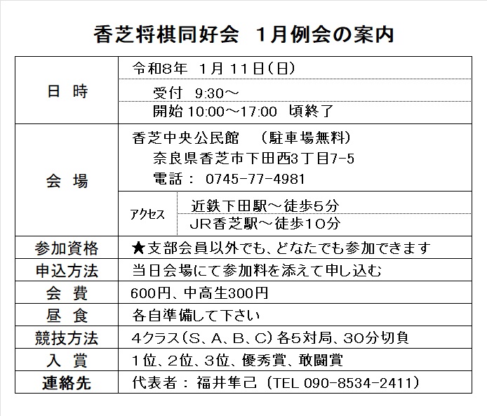 香芝将棋同好会は、原則毎月第2日曜日に、香芝中央公民館で例会を実施しています。