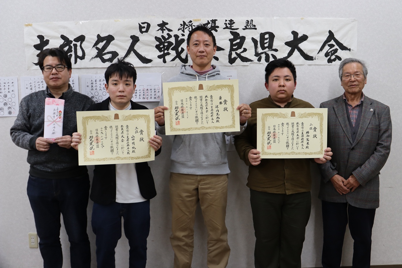 - 左から、4位・葛本崇太さん、3位・西 淳平さん、優勝・古作 登さん、準優勝・辻ノ内克成さん、結崎支部支部長・吉岡秀夫さん