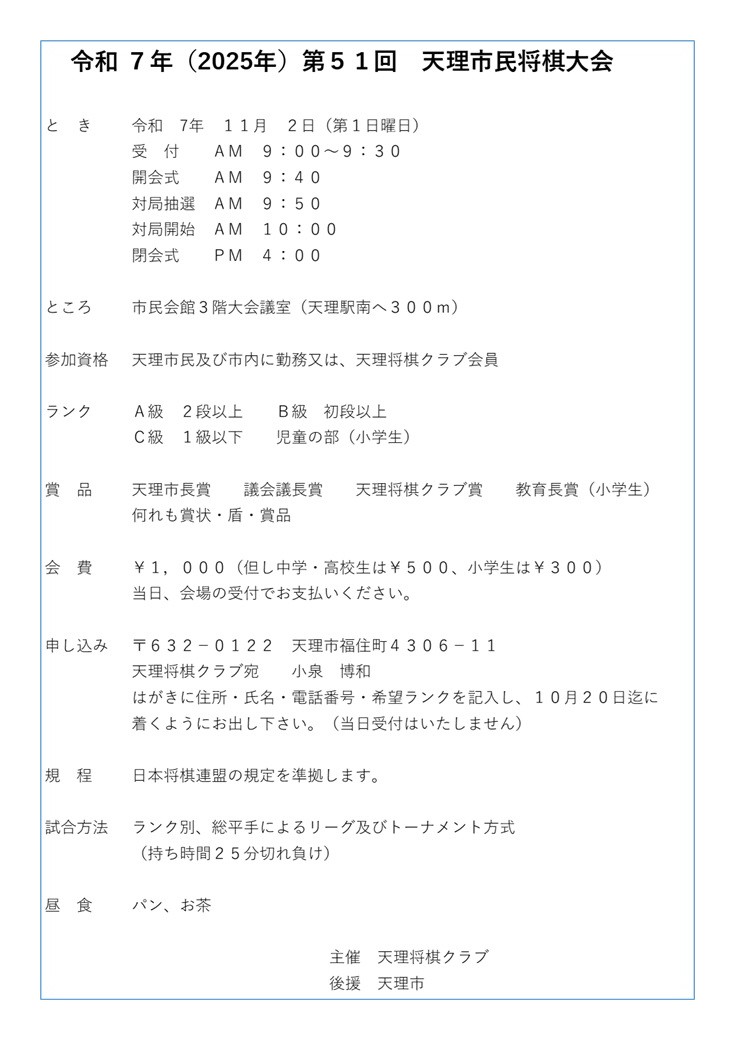 - 第50回天理市民将棋大会は11月3日(日)3連休の中日、将棋日和ではない快晴の日に行われました。