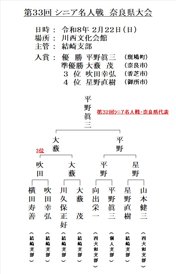 - ◆第33回シニア名人戦 奈良県大会 2026/2/22(日) 川西文化会館 参加者14名