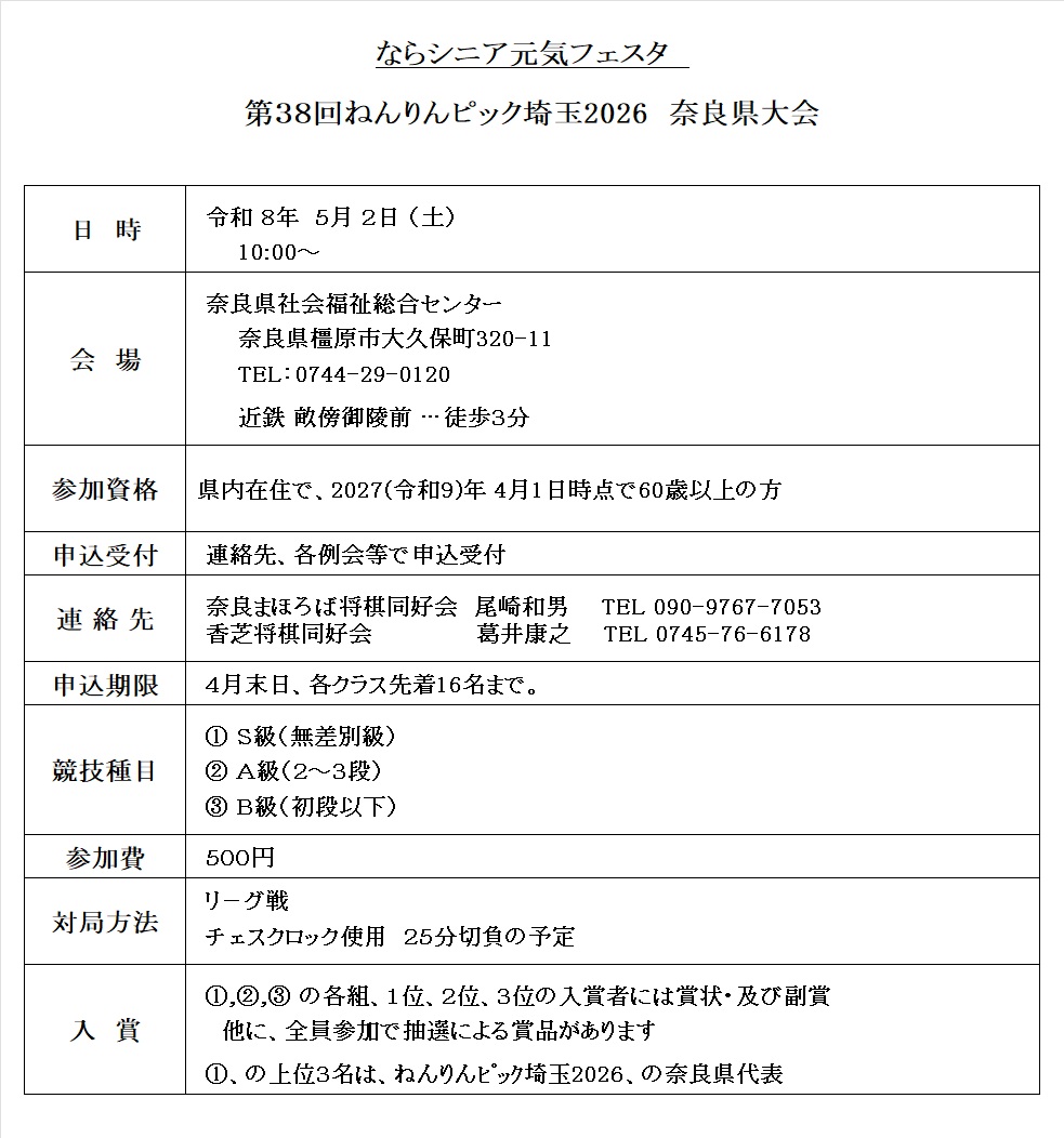 たが将棋大会(総合開会式)はコロナ禍を考慮して中止といたしました。奈良県代表選手3名の選出は、