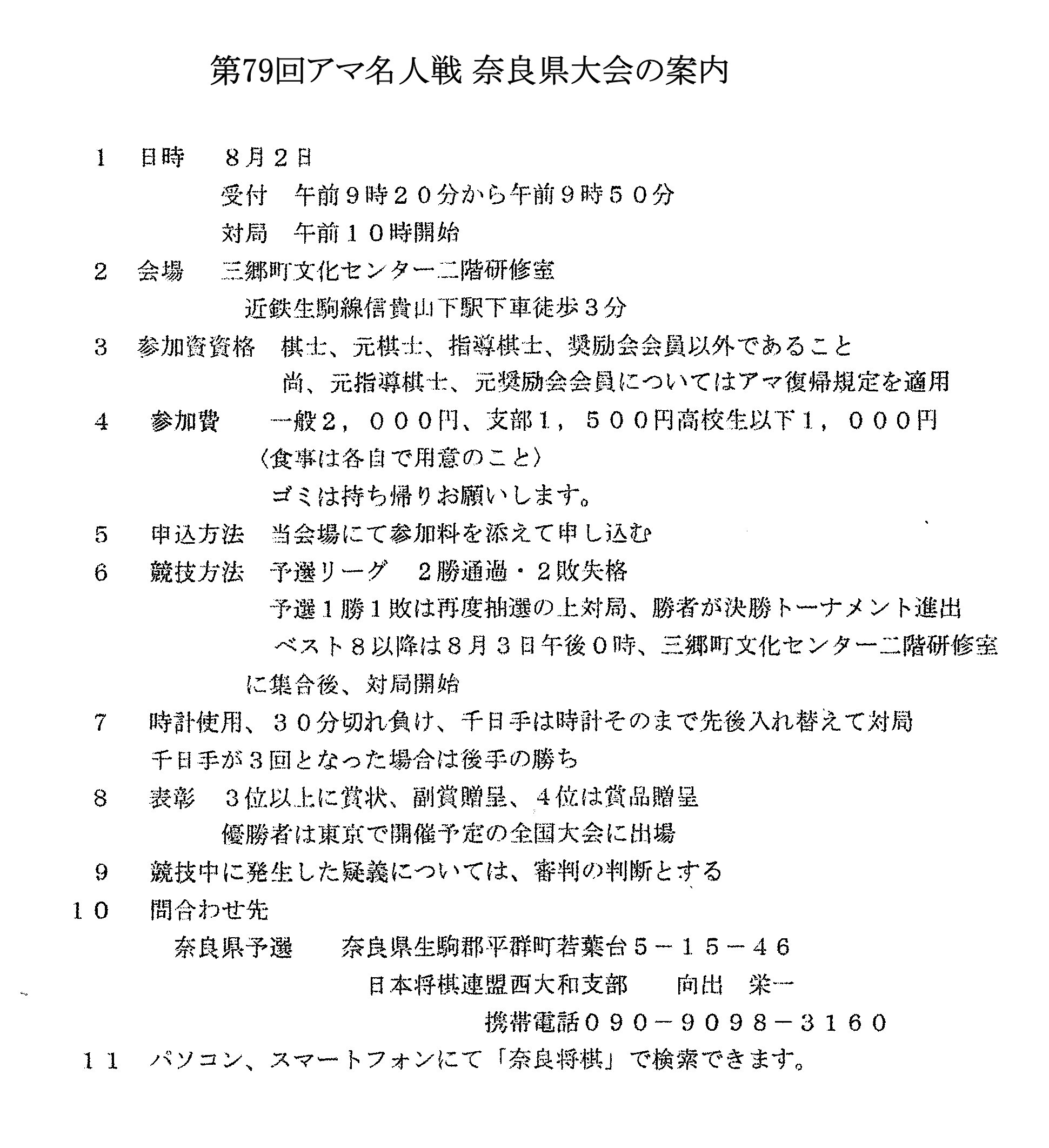 尚、参加資格は、各代表選 考会によって異なりますので、ご不明な場合は日本将棋連盟普及部 アマ名人戦係(電話・03-3408-6165、メール fukyu@shogi. or.jp)または選考会主催者に問い 合わせてください。