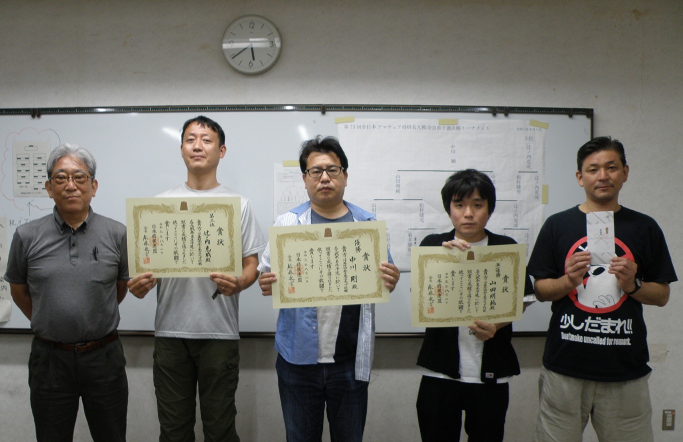 - 左から、西大和支部長・笠井 潔、3位・辻ノ内克成、優勝・中川 剛、準優勝・山田明純、4位・松村健児