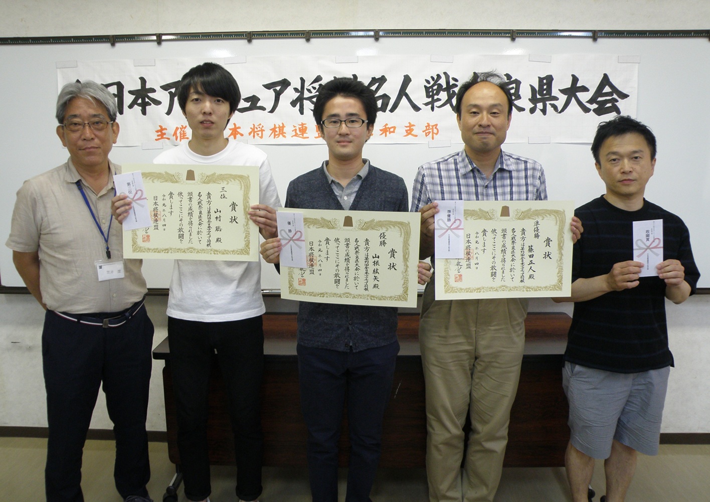- 左より、西大和支部長・笠井 潔さん、3位・山村 聡さん、優勝・山根紘矢さん 、準優勝・篠田正人さん、4位・青木宏人さん