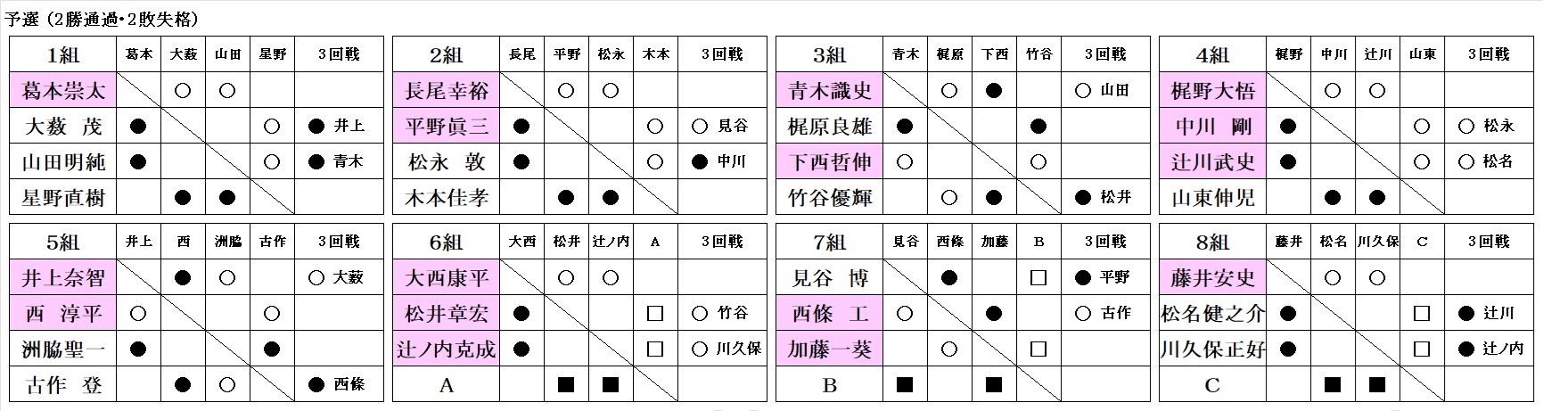 - 決勝戦、 西 vs 梶野 記録、辻ノ内 3位決定戦、 山田 vs 笹田