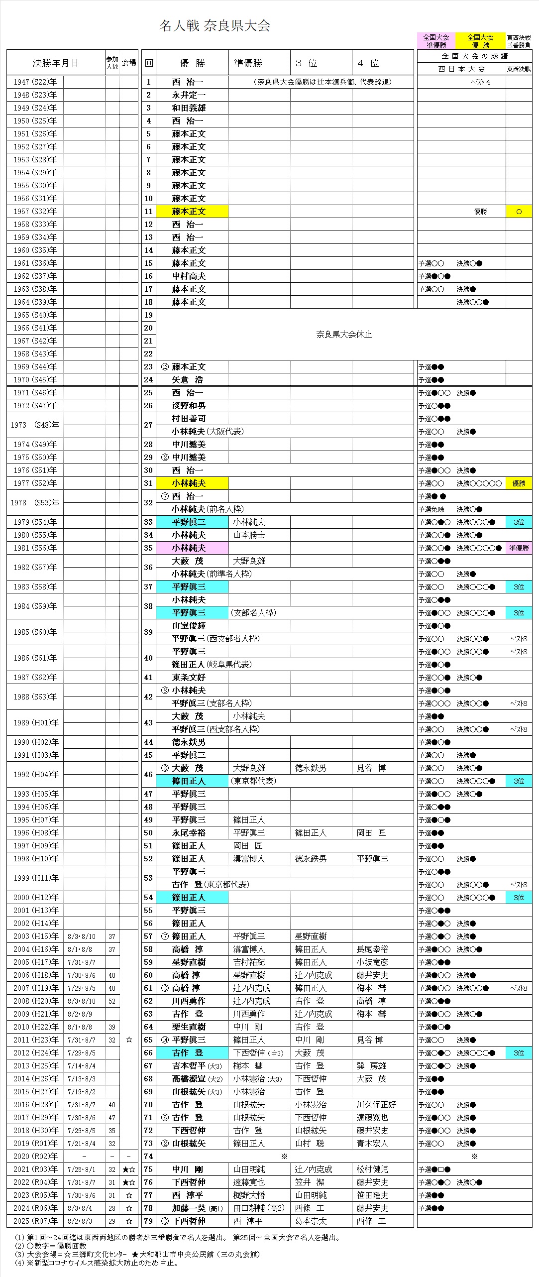 第76回名人戦・奈良県大会 2022/7/29 大和郡山市中央公民館 8/7 三郷町文化センター 参加者31名