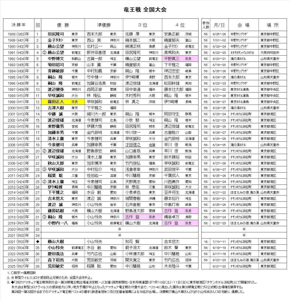 - 6月22、23日に第32回アマチュア竜王戦全国大会が山形県天童市「滝の湯ホテル」にて開催された。全国の都道府県の予選を勝ち抜いた代表54人に招待選手2人を加えた総勢56人で