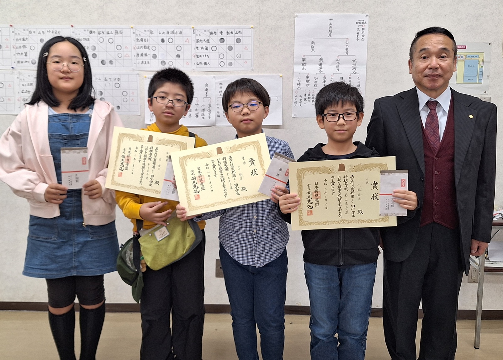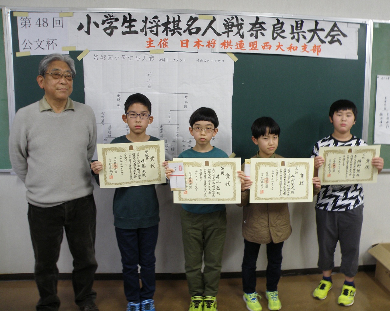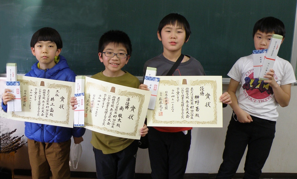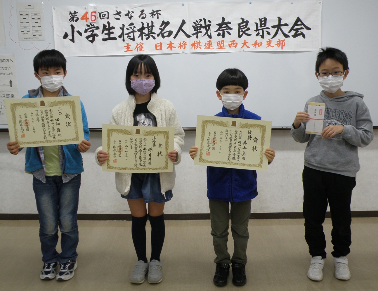 - 優勝した、井上岳 さん(小3)は、第46回さなる杯 名人戦奈良県代表として大阪で行われる西日本大会(3月6日)に出場。 また、第1回棋童戦低学年の部でも奈良県代表として東京で行われる全国大会(2月28日)に出場します。1週間に2度の全国大会になります、全国優勝を持って帰って下さい。応援しています。準優勝の堀月乃さん(小4)、決勝戦は優勢の将棋でしたのに残念でした、強いですね。次回を楽しみにしています、これからも頑張って下さい。 (見谷)