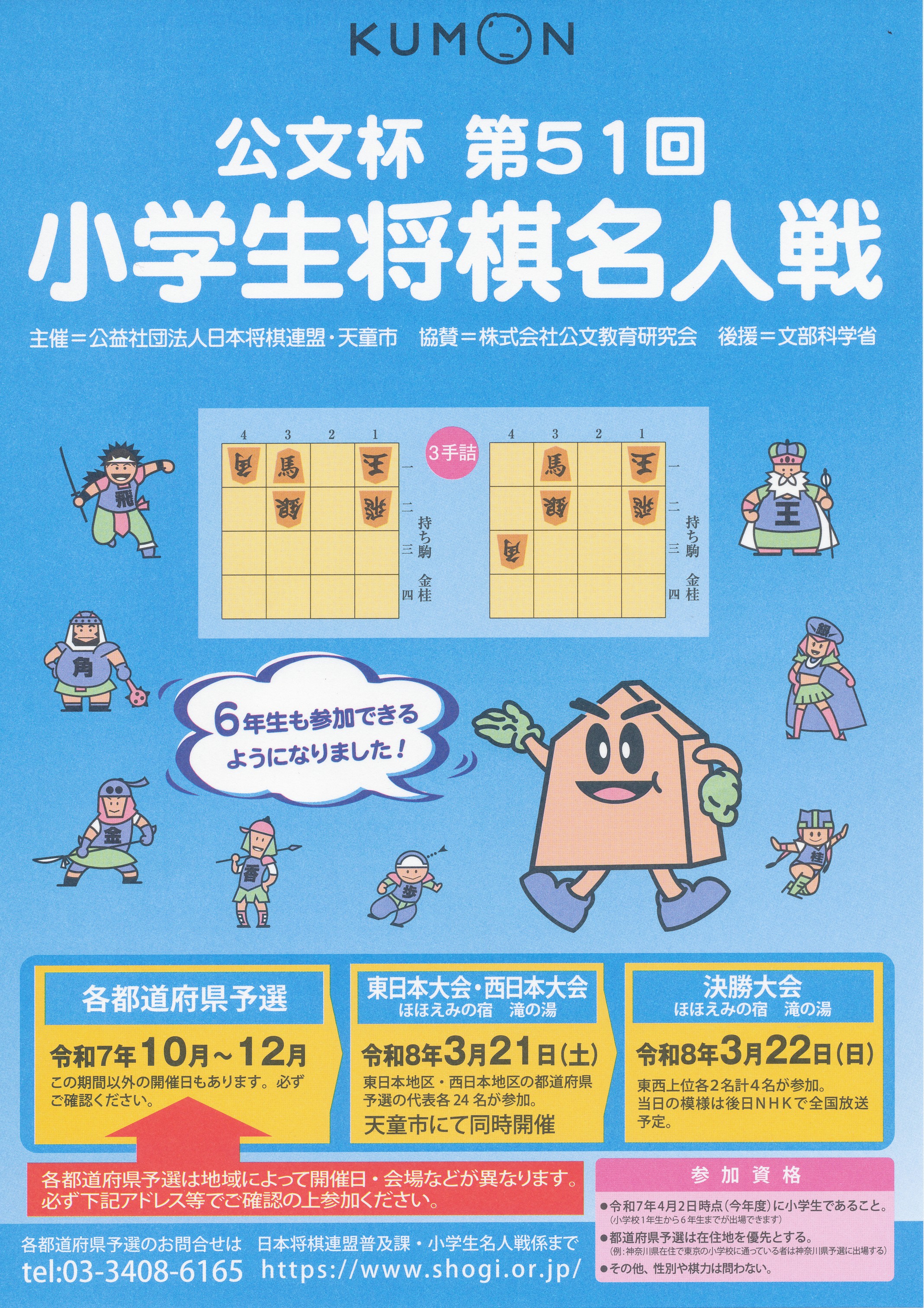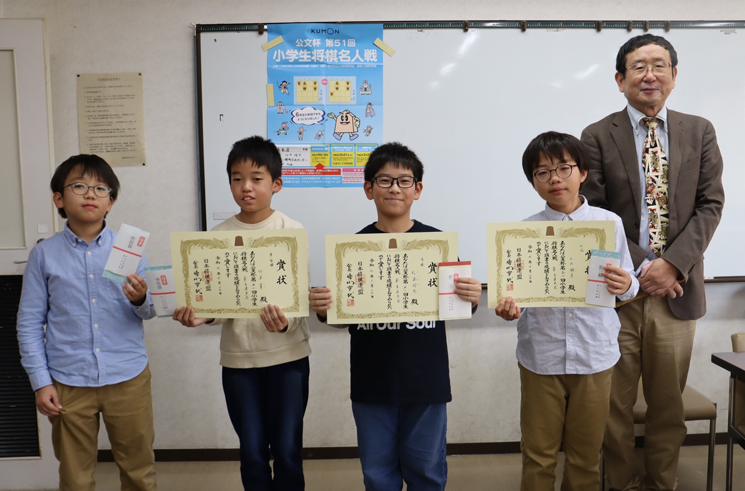 - 令和5年3月19日(日)、新梅田研修センター(大阪市北区)にて「公文杯第48回小学生将棋名人戦西日本大会」を開催しました。西日本代表は永山遥真さん(京都府)と井上岳さん(奈良県)に決まりました。東日本代表2名とともに決勝大会に出場します。決勝大会の模様はNHKにて放映予定です。