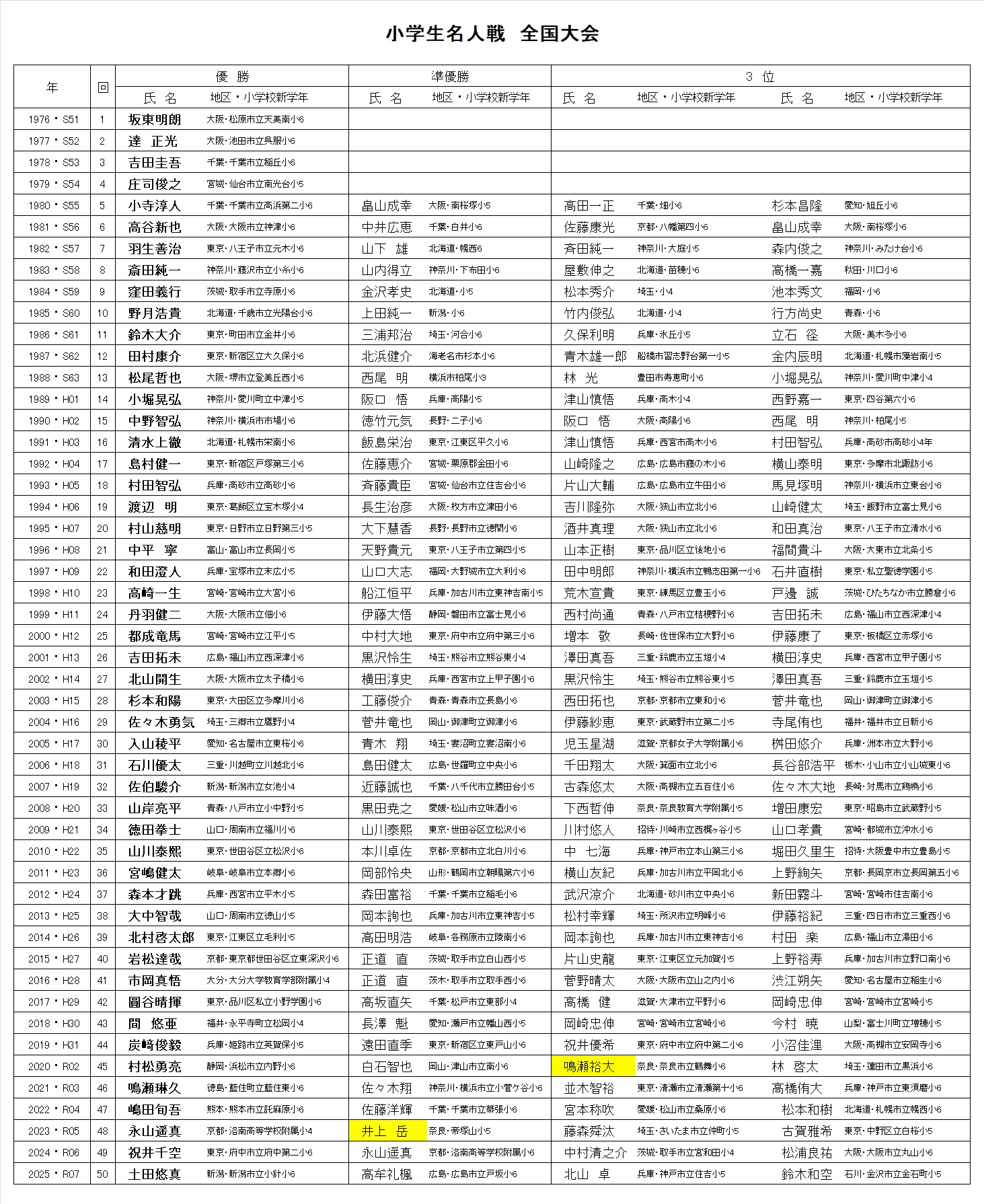 - 小学生将棋名人戦は1976年の第1回大会から続く伝統ある小学生将棋大会です。渡辺明名人や羽生善治九段を始めとする数多くの棋士を輩出し、都道府県予選には毎年3,000名以上の選手が参加する小学生将棋の最高位を決める大会となっています。