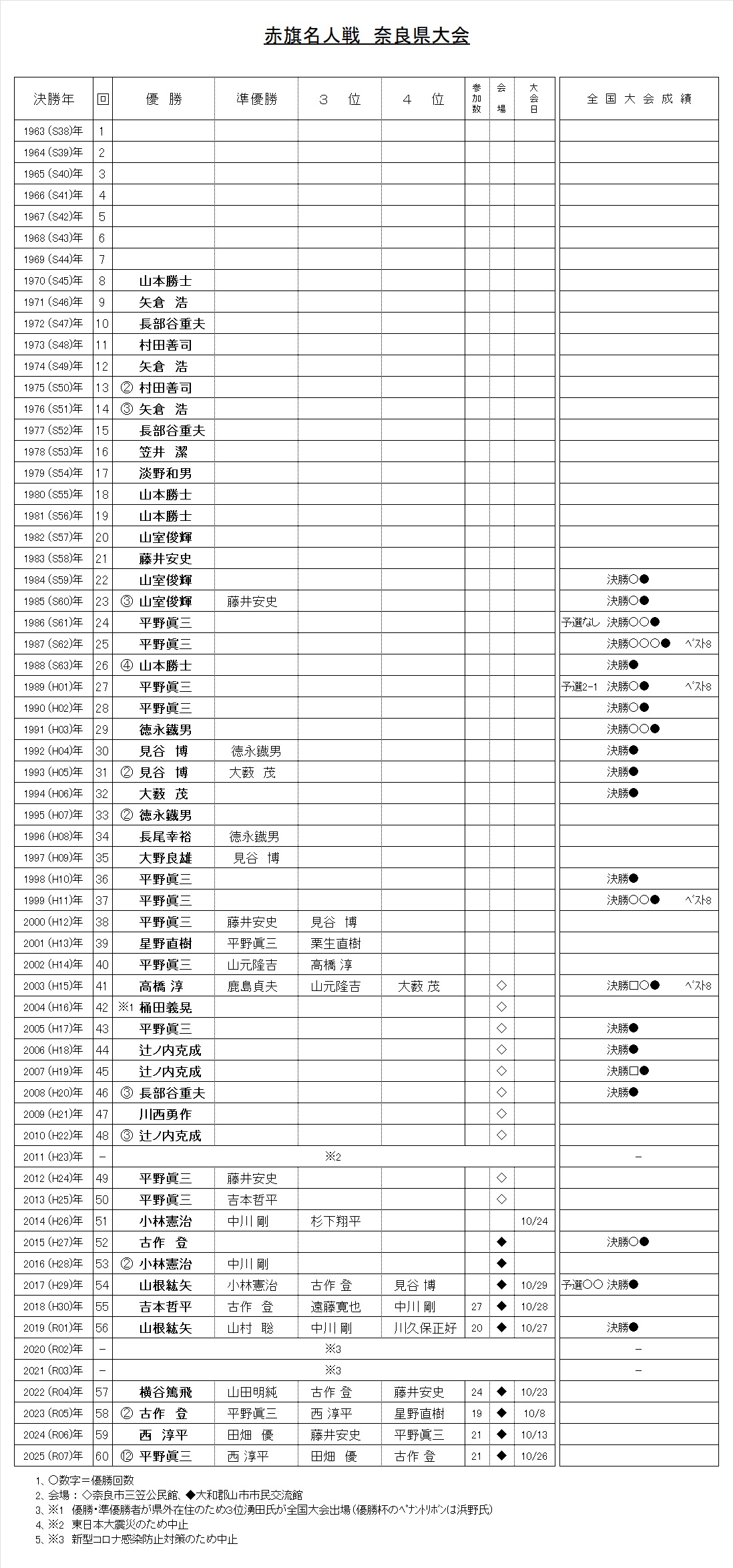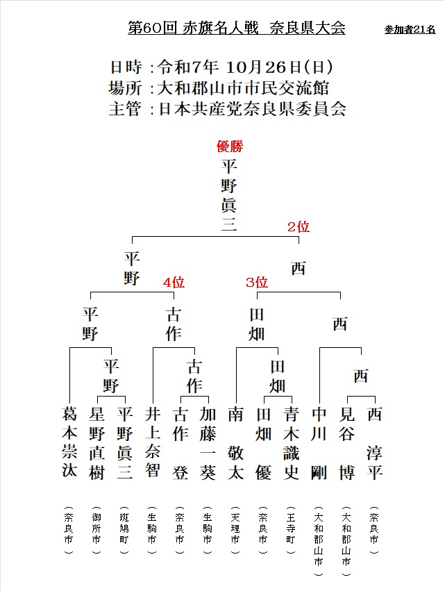 - ◆第60回赤旗名人戦 奈良県大会 2025/10/26(日) 大和郡山市市民交流館 参加者21名