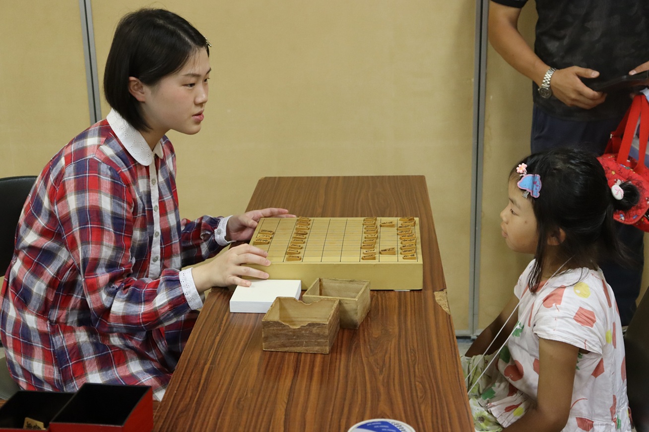別室では、プロ棋士、伊藤博文七段・藤井奈々初段の指導対局がありました(無料)