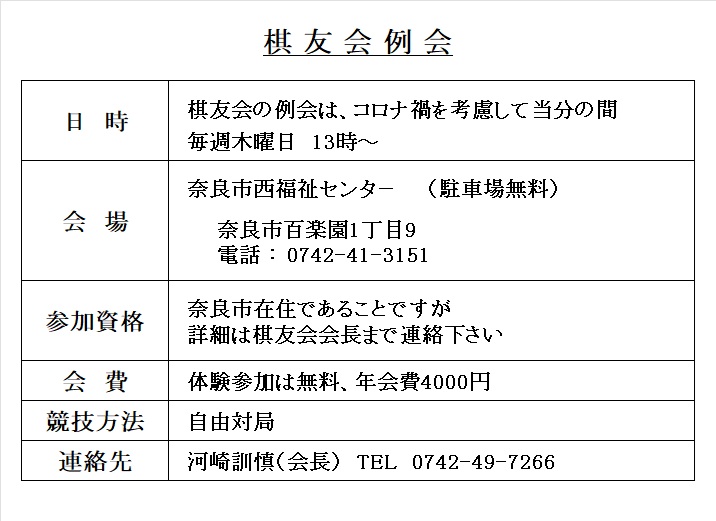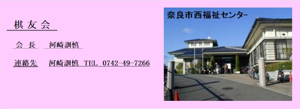但し対外試合に参加する場合は、どなたでも参加できます。1 月 4日(木) 新春将棋大会 12:30~ 修 了 4 月 10日(火) 第1回棋楽ト-ナメント大会 予選リ-グ戦 4/10(火)~4/19(木) 修 了 4 月 24日(火) 第1回棋楽ト-ナメント大会 決勝ト-ナメント戦 4/24(火)~5/10(木) 修 了 6 月 22日(金) 寧楽棋会vs棋楽会 親善将棋大会 (会場:奈良市西福祉センタ-) 修 了 7 月 28日(土) 第4回「古都奈良将棋団体交流戦」(会場:奈良中部公民館) 修 了 9 月 2日(日) 棋友会&近畿車両 親善将棋大会 (会場:東大阪勤労市民センタ-) 修 了