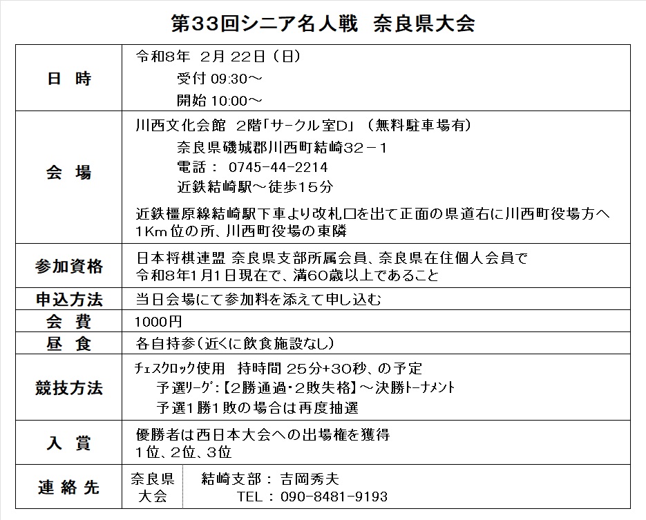 - ◆第33回シニア名人戦 奈良県大会 2026/2/22(日) 川西文化会館 参加者14名