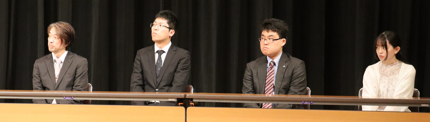 - 左より、審判員棋士 久保利明 九段、 大石直嗣 七段、 高田明浩 五段、 久保翔子 女流一級