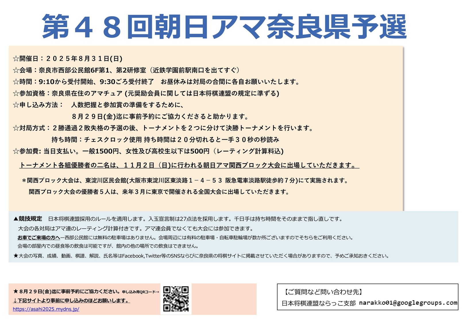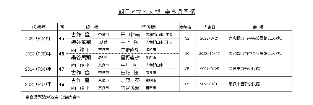 奈良県代表者2名を選出して、令和7年11月2日(日)の朝日アマ関西ブロック大会に進みます。