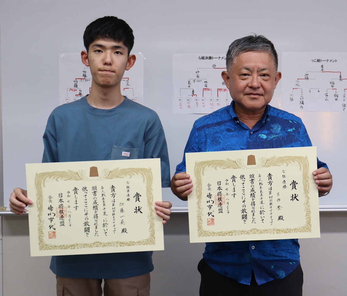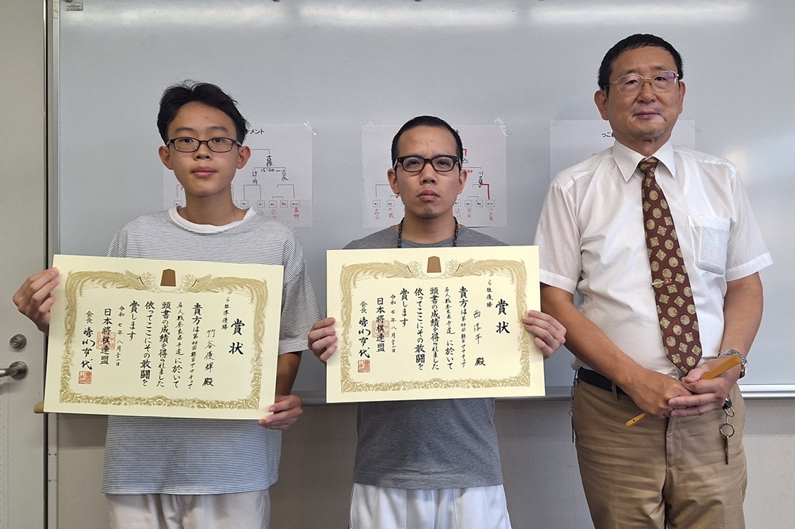 - 左から、な組準優勝・加藤一葵さん ・優勝・古作 登さん ら組準優勝竹谷優輝さん、優勝・西 淳平さん、神崎健二 八段