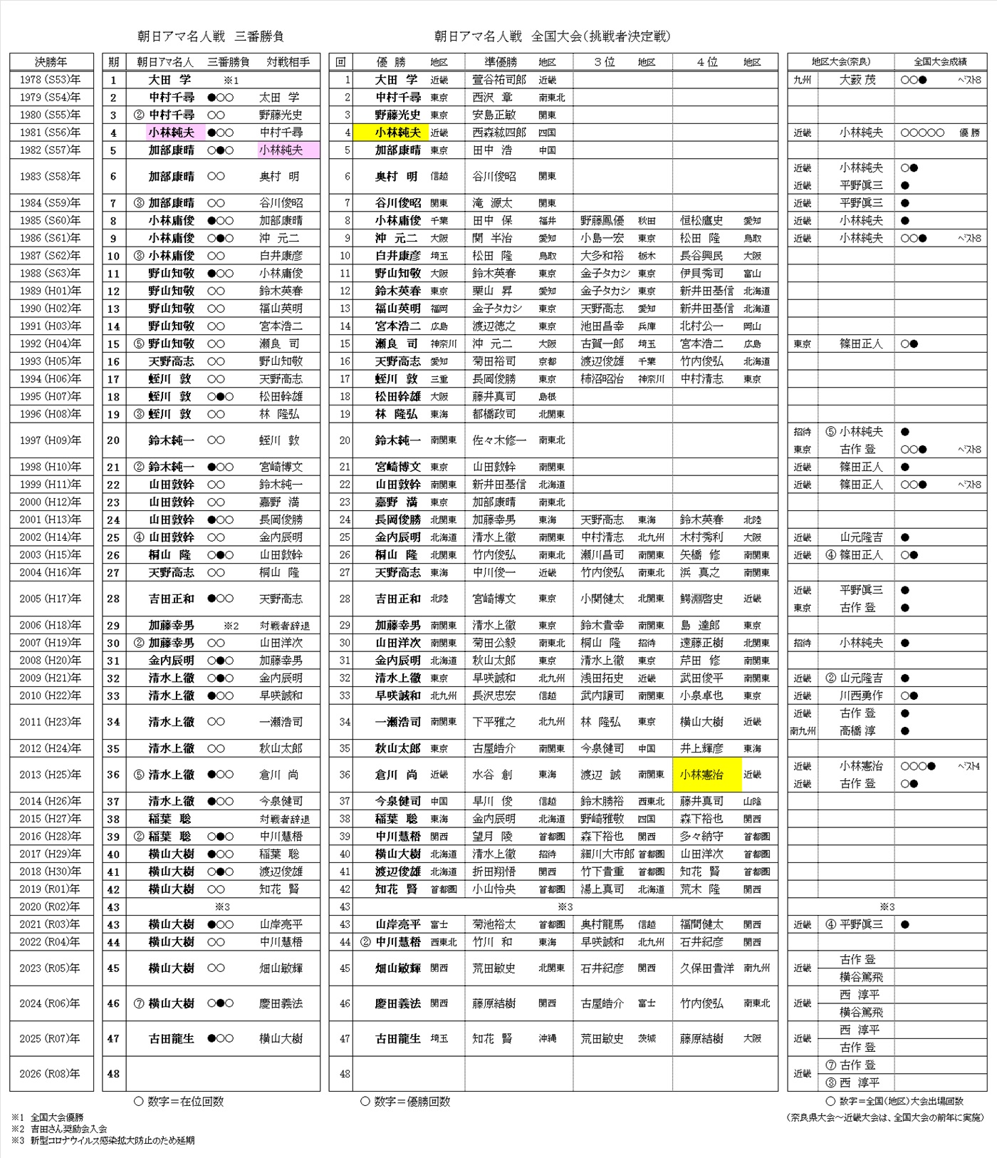 全国大会優勝者と朝日アマ名人による三番勝負が例年5~6月に行われます。