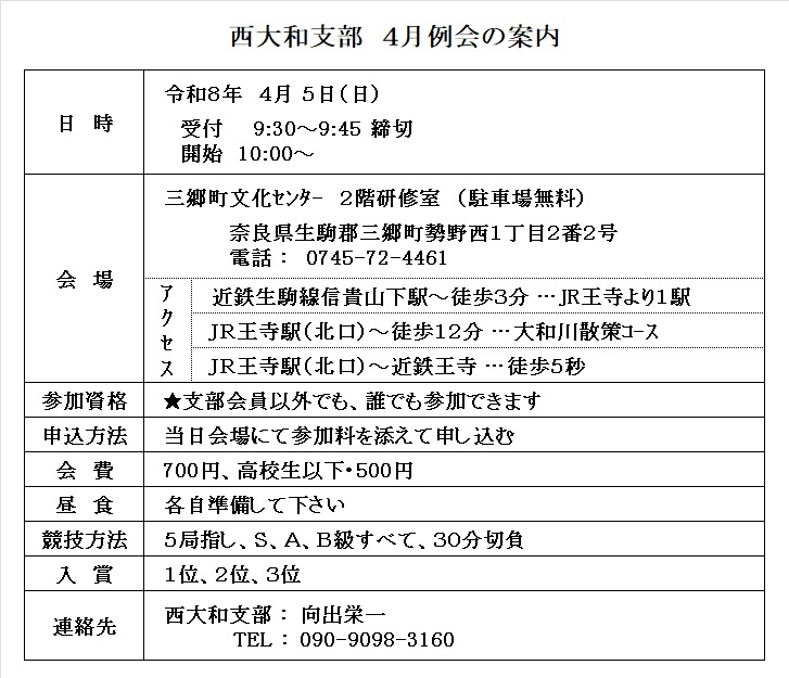 西大和支部 令和8年 1月例会 (30分切負) 2026/1/4(日) 三郷町文化センタ- 参加者33名